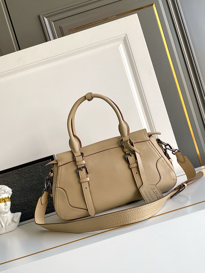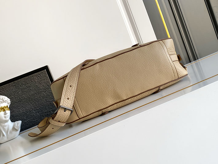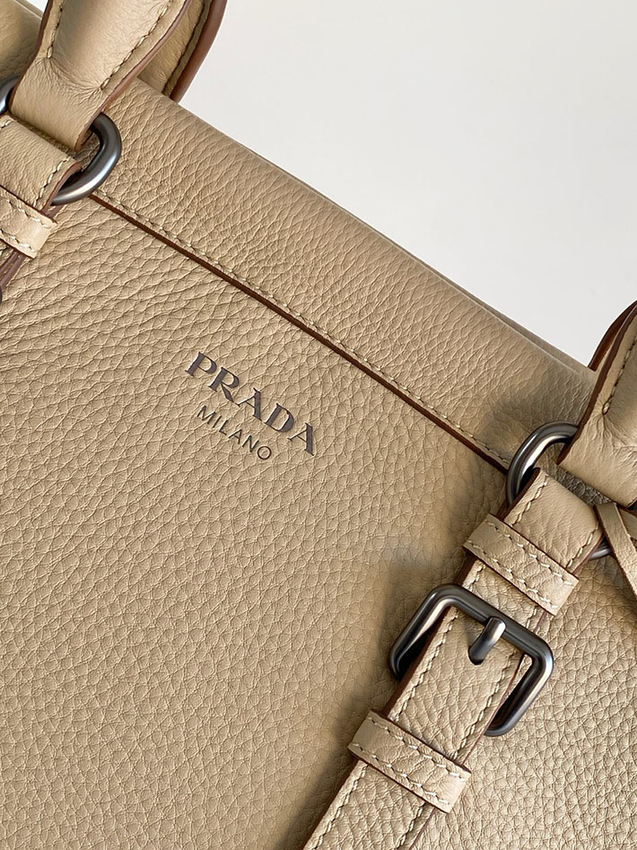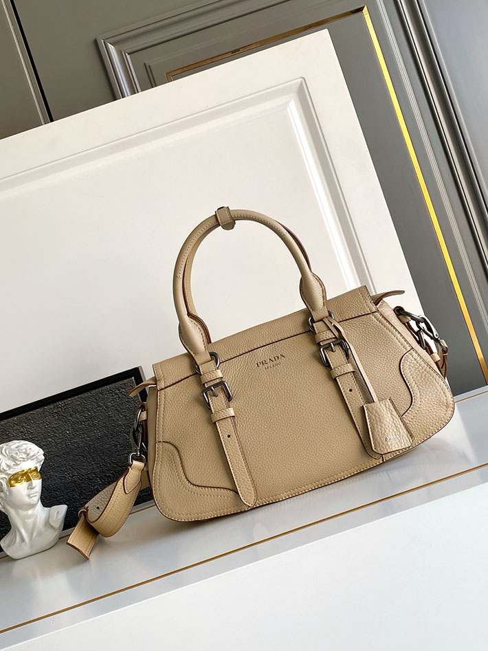 過去と現在の調和の中で、このバッグはプラダのDNAのルーツに立ち返り、旅をテーマにしたデザインを想起させます。豊かな質感と不規則なシボのあるレザーで作られたコンパクトで多用途なシルエットは、アクセサリーをさまざまなスタイルで身につけられるよう、取り外し可能なショルダーストラップで仕上げられています。旅行バッグに着想を得た補強されたコーナーは、伝統的な職人技とアーカイブとの絶え間ない対話を表現しています。