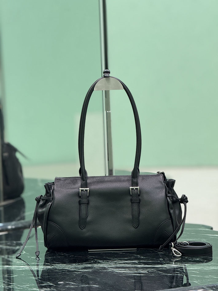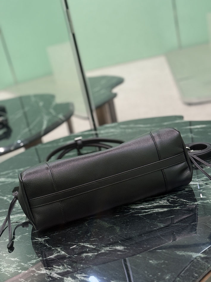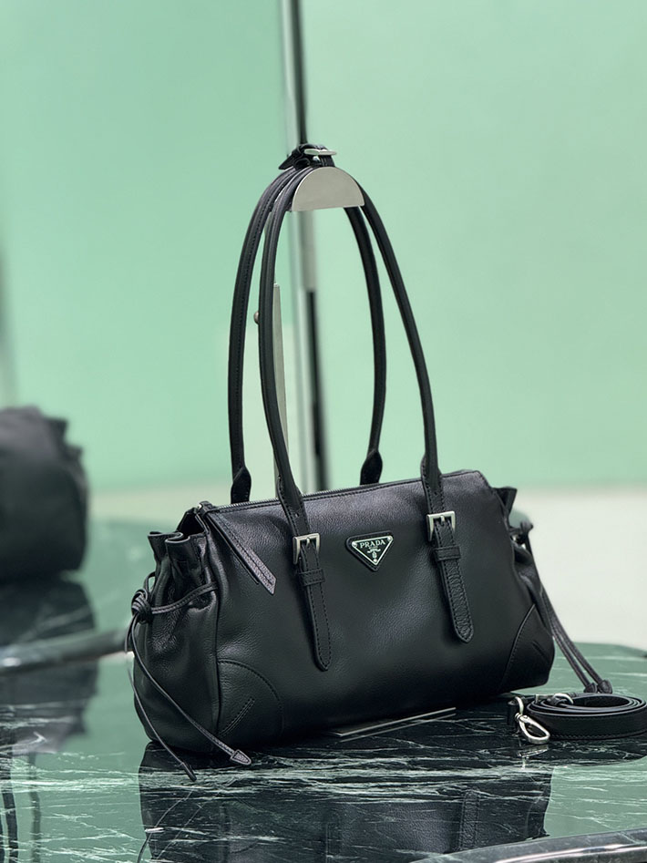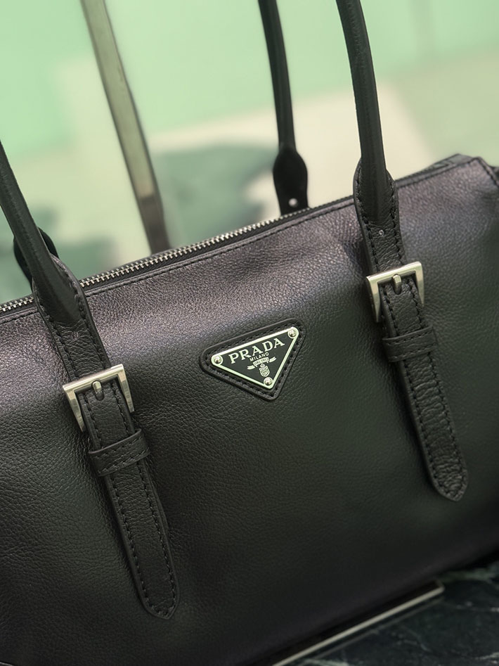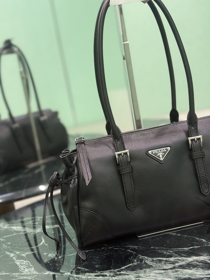 アンティーク仕上げのレザー バッグは、洗練された現代的な個性を体現しています。幾何学的なシルエットは、アーカイブのディテールとともに、モダンさとエレガンスを融合させており、伝統と革新の絶え間ない対話を表現しています。メタルバックルとサイドレースは、過去のプラダのアイコニックなスタイルを彷彿とさせる一方で、長めのハンドルは実用的でカジュアルな姿勢を示しています。