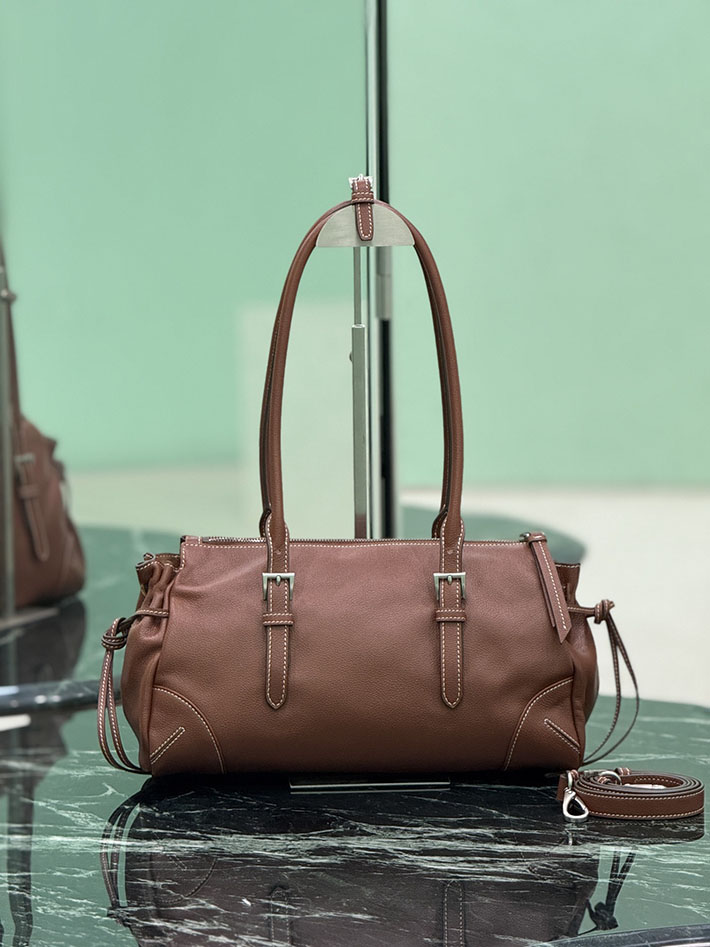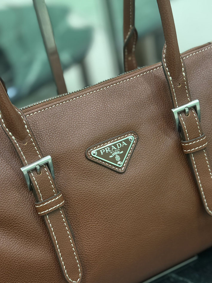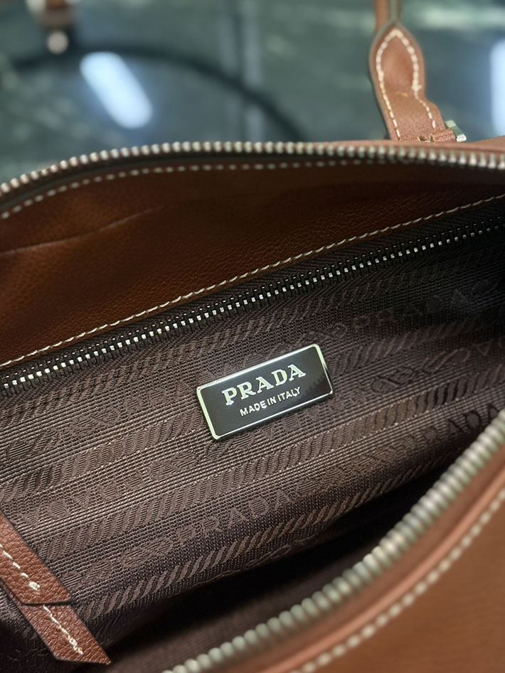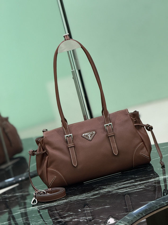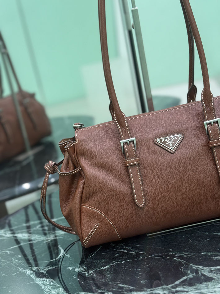 アンティーク仕上げのレザー バッグは、洗練された現代的な個性を体現しています。幾何学的なシルエットは、アーカイブのディテールとともに、モダンさとエレガンスを融合させており、伝統と革新の絶え間ない対話を表現しています。メタルバックルとサイドレースは、過去のプラダのアイコニックなスタイルを彷彿とさせる一方で、長めのハンドルは実用的でカジュアルな姿勢を示しています。
