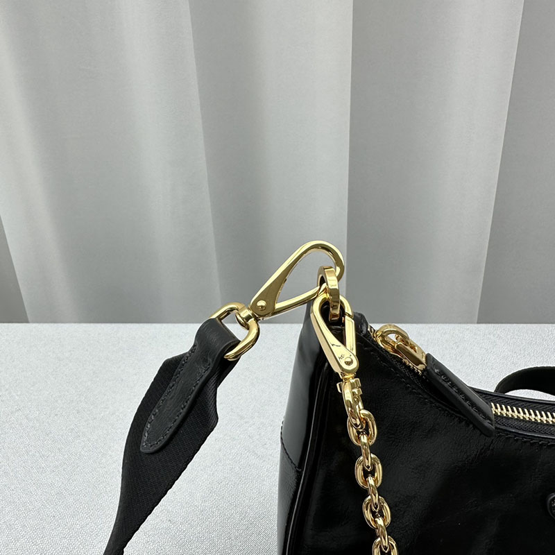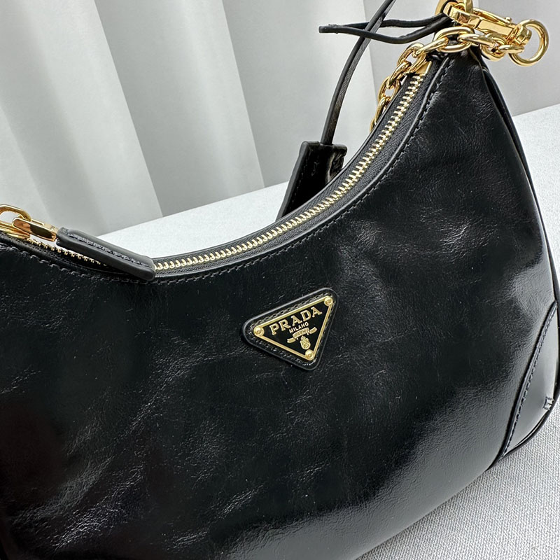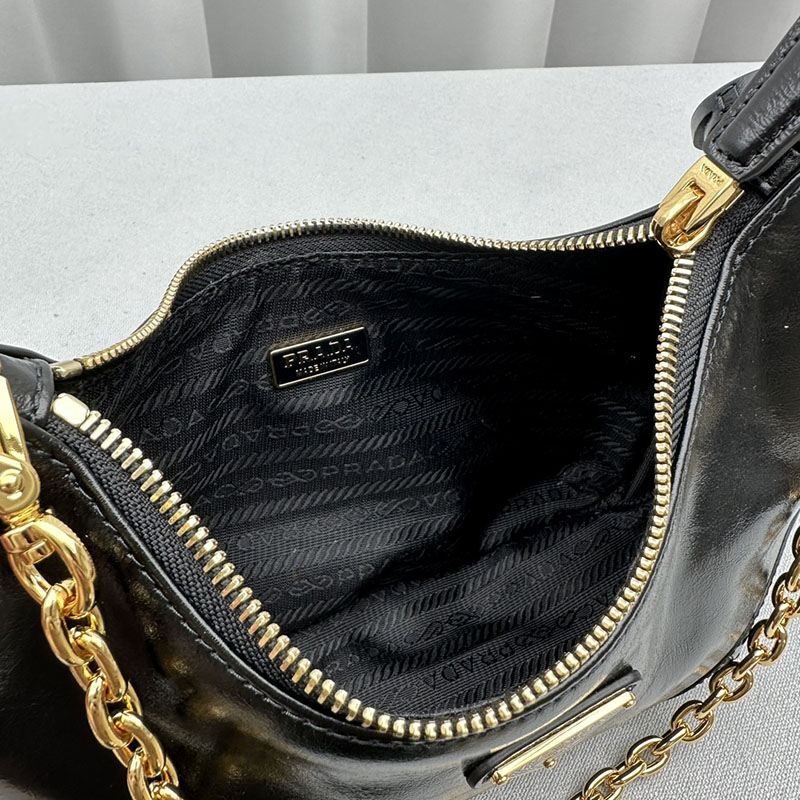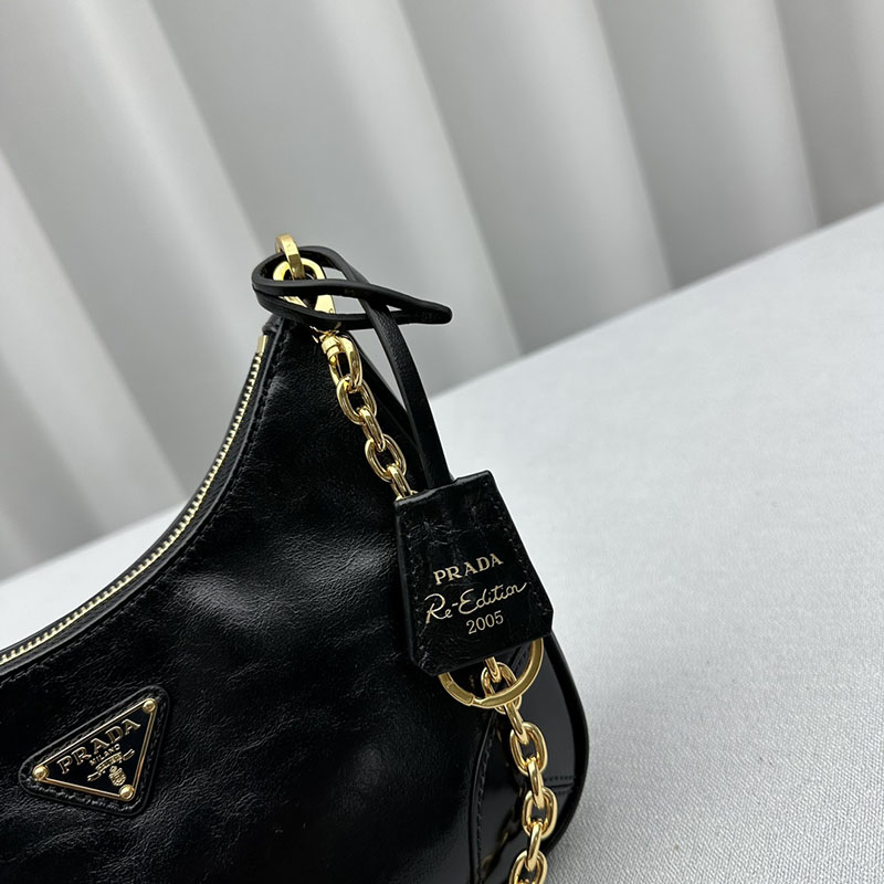 デザインを再解釈したプラダ Re-Edition 2005 ショルダーバッグ。ナプラックパテントレザー(ラムスキン)を使用し、独特の光沢とヴィンテージの質感をプラスしています。仕上げに取り外し可能なトリックをあしらい、個性のある現代的なアクセントを添えました。