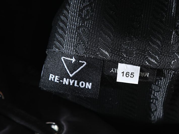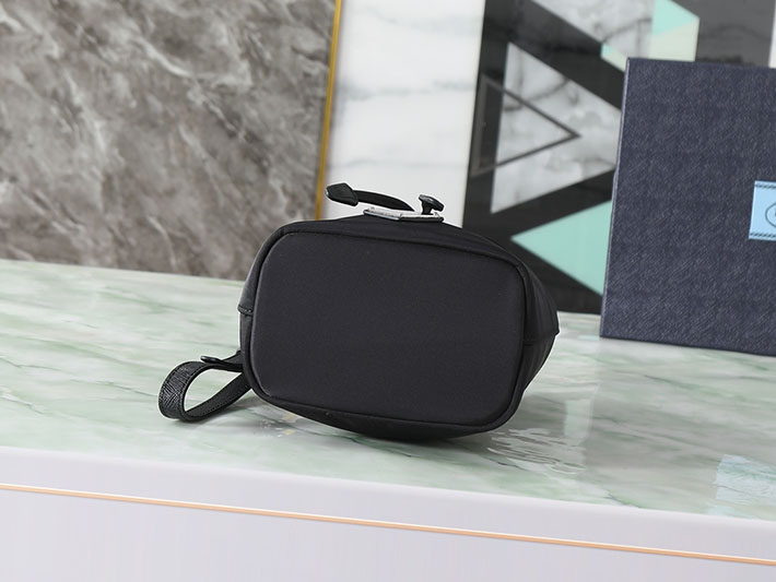 海から回収されたプラスチック素材をリサイクルして作られたプラダの革新的なファブリックであるRe-Nylonを使用した、ドローストリング開閉式のポーチ。取り外し可能なレザーのリストストラップを備えた実用的なデザイン。