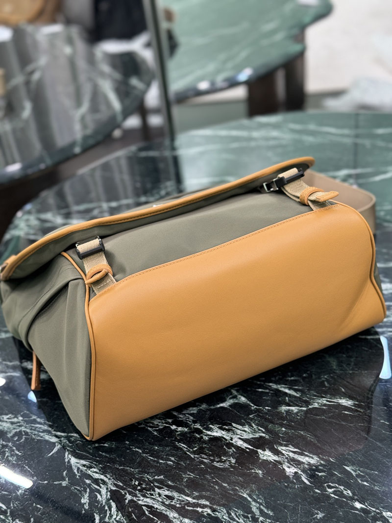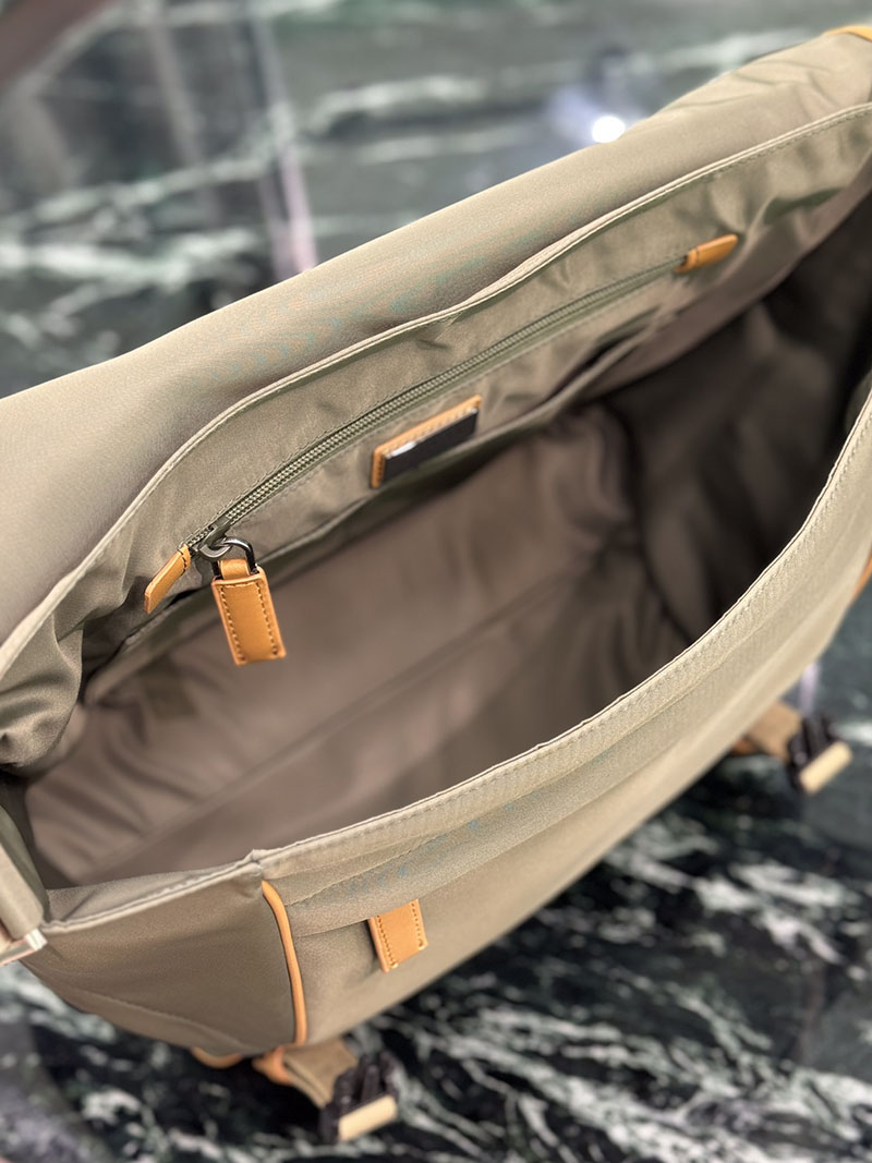 取り外し可能なミニポーチ付ショルダーストラップが付属したフラップバッグ。海から回収されたプラスチック素材を再利用、浄化して作られた再生ナイロン糸を使用したファブリックRe-Nylonとプラダを代表する「サフィアーノ」レザー(牛革)をミックス。エナメル トライアングルロゴをあしらい、現代的なデザインと伝統を融合しました。