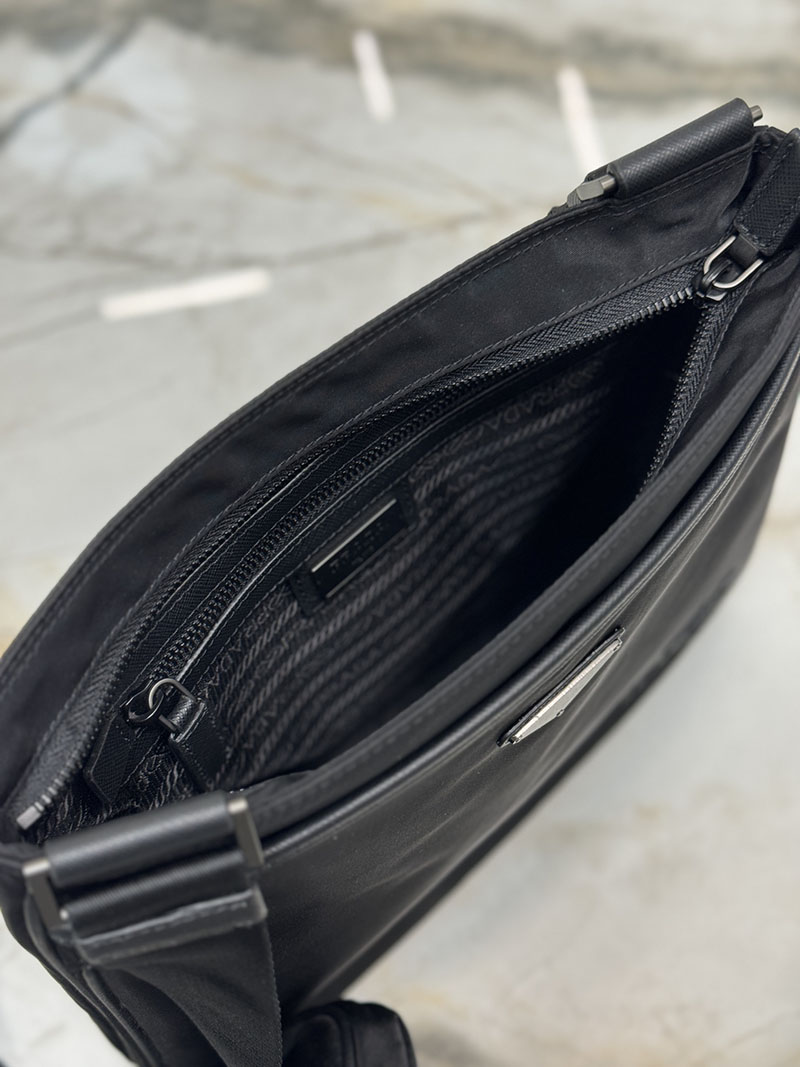 「サフィアーノ」レザー(牛革)と海から回収されたプラスチック素材で作られた再生糸であるRe-Nylonを使用した、スリムなシルエットとスクエアシェイプが際立つバッグ。調節可能なナイロンテープのショルダーストラップを備えたファスナー開閉式のデザイン。フロントにアイコニックなエナメルメタルのトライアングルロゴがあしらわれています。