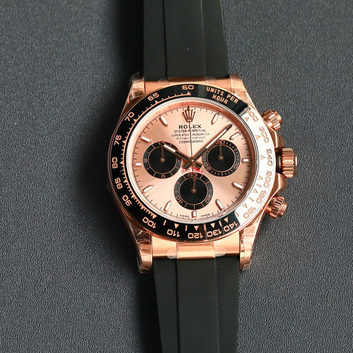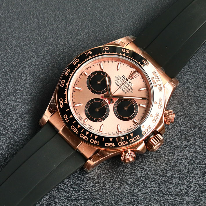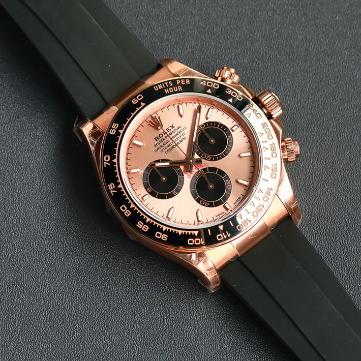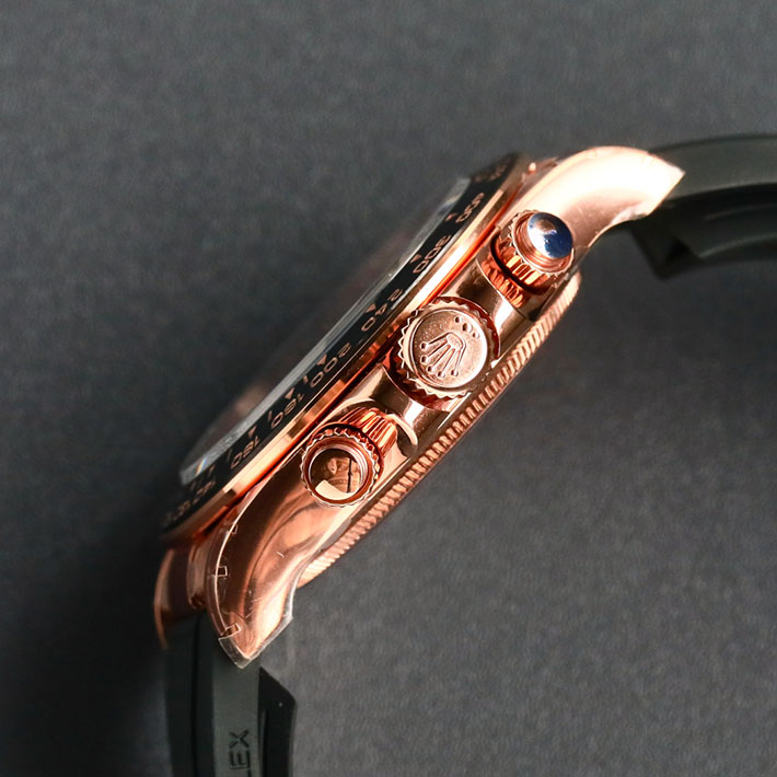 デイトナのラバーベルトモデルです。“オイスターフレックス”と呼ばれるロレックスが独自に開発したラバーベルトが装着されております。金属のブレードをブラックエラストマーというゴム状の物質でコーディングされておりメタルブレスレット並みの耐久性が確保されております。ベルトの内側には“縦方向クッションシステム”が備えられており優れた装着性を誇ります。今作からはベゼルのフチ周りにミドルケースと同一素材のメタルが使用されています。